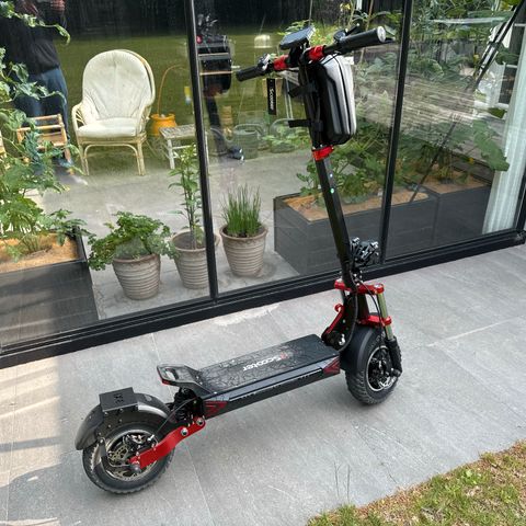 2400w, 2x1200w for og bag. Hydraulisk bremser, 55 km/t top fart. 3 hastighedstrin. Kraftig opbygget. NFC kort læser til at låse op, digital display. Blinklys, bremselys, og RGB lys i logoerne. Lyset kan skiftes via en boks ved batteriet. Batteriet kan tilgås via app. Er et år gammelt, kører perfekt, næsten ikke brugt.