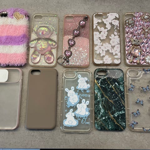 Apple mobilcover i forskellige farver og med forskellige motiver, herunder gennemsigtige covers med tegneseriefigurer og solide covers i rød og blå. Coversne er designet til at beskytte mobiltelefonen mod ridser og mindre stød. Materialerne varierer mellem blød plast og silikone. Passer til specifikke Apple-telefonmodeller.