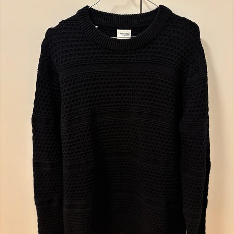 Selected Homme Striktrøje i grå farve, størrelse M til mænd. Trøjen har en rund halsudskæring og er fremstillet i et strikket materiale, der giver en struktureret overflade. Velegnet til casual brug.