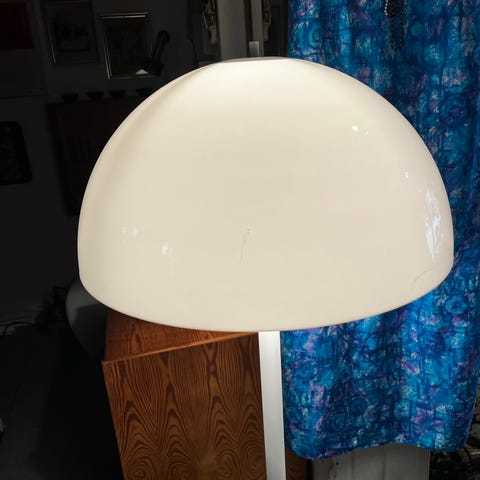 Super FLOT standerlampe. model Champion, fremstillet hos Knud Christensen Electric A/S, MÅL: H: 130 cm. Ø: 50 cm. Formgivet og fremstillet i 1970’erne. Udført i hvidlakeret stål og skærmen er i opalakryl. Foden er tung og stabil. Lampen kommer fra ikke ryger hjem og fremstår i rigtig god stand uden nævneværdige brugsspor. Lampen kan leveres i Københavnsområdet for en lille mere betaling. En ægte klassiker.
