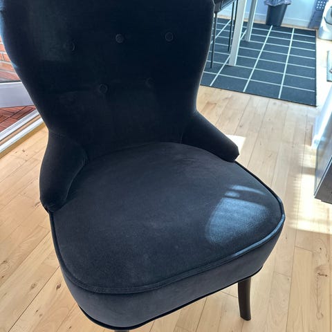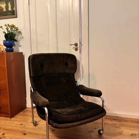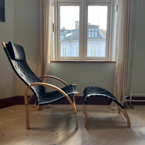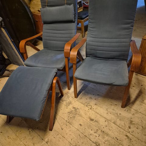 2 stk Retro Finsk design lænestol RIMBO - har været at finde i ikea kataloget 1996 - udgået vintage ikea stol samt skammel - den anden er sort med samme farve polstring