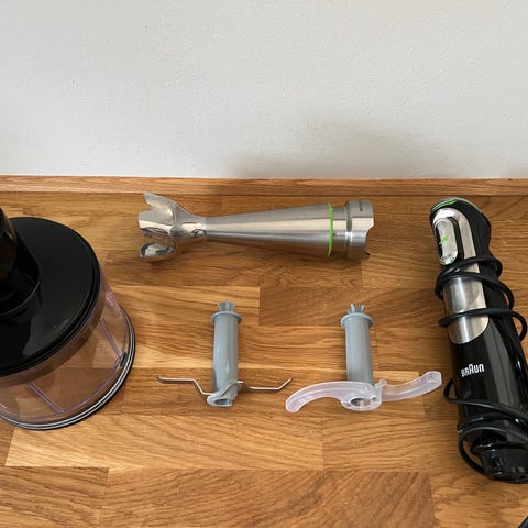 Braun stavblender i hvid og blå farve. Kompakt design med et ergonomisk greb og ledning til strømforsyning. Velegnet til blendning af fødevarer i køkkenet.