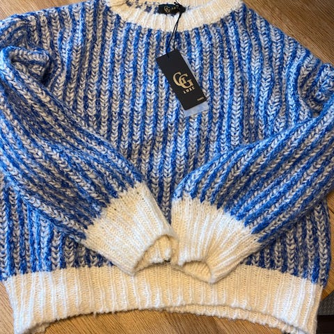 Str M, 38-40, grå med mønsterstrikket bærestykke, ribkant rundt i halsen, forneden og ved håndled ,Brystvidde 90-96 cm, hoftevidde 100-104 cm. 71 % polyacryl, 26 % polyester, 3% elasthan. Sender gerne, dog ikke med fiks færdig, porto oveni