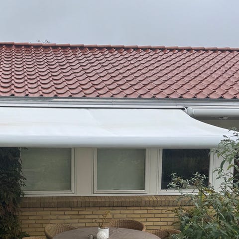 Elektrisk markise med fjernbetjening. Kanten er ikke så pæn. 2,90 m i breden.