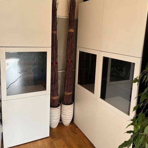 4 glashylder, 6 letluk hængsel, 8 hvidhylde. Pris 1500 for begge højskabe, for et 800 kr