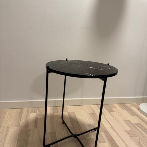 Elegant rundt sidebord fra H&M Home. Bordpladen er i hvidt marmorlook med naturlige årer, og stellet er i sort metal. Perfekt som sofabord, natbord eller som lille afsætningsbord i stuen.