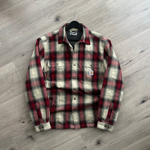 Fed Carhartt workwear-jakke i kraftig kvalitet. Klassisk stribet design med bryst- og frontlommer samt trykknapper. Kan bruges både som let jakke og som overshirt – perfekt til overgangsvejr. Herremodel – kan også bruges af damer (oversize look)”.