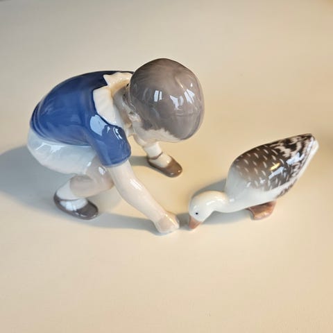Figuren viser et dreng i en siddende stilling med detaljeret ansigtstræk og tøj. Den er lavet af porcelæn af Ingeborg Plockross for Bing og Grøndahl. Nr. 1636 Tilhørende gås er ikke med. ,Afhentes i:,Røde Kors Egå (751),Bemærk at mail, chat og beskeder ikke besvares, og varen skal købes på knappen "Gå til varen"