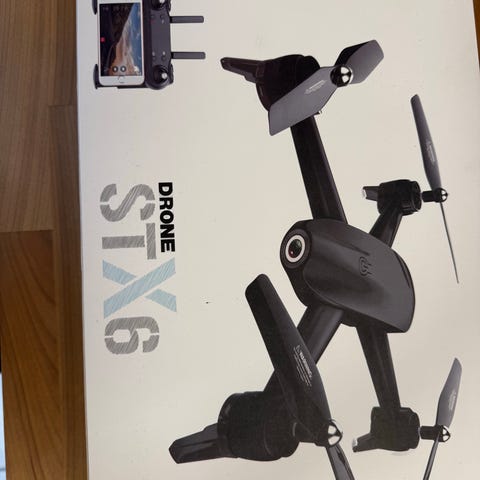 XK X-300 drone med fjernbetjening. Dronen er hvid og udstyret med propelforhøjere for beskyttelse. Den har indbygget kamera til optagelse under flyvning. Fjernbetjeningen har LCD-display og flere kontrolknapper for præcis styring. Inkluderer to batterier og oplader til drone og fjernbetjening og ekstra propel.sat fire løfte bånd på de ses på armene for sjov.