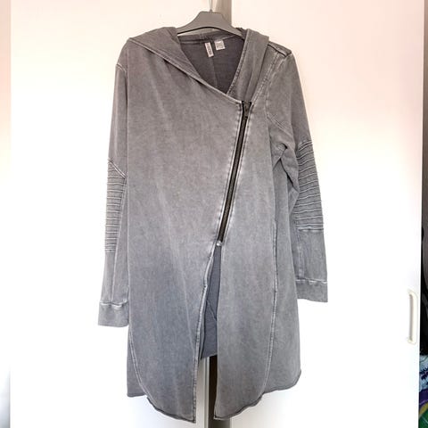 Størrelse M, sættet består af en lang åben cardigan med bølget kant og lange ærmer + et par bukser med et stykke stof foran der får dem til at ligne en lang nederdel, med bindesnor og elastik i taljen.
