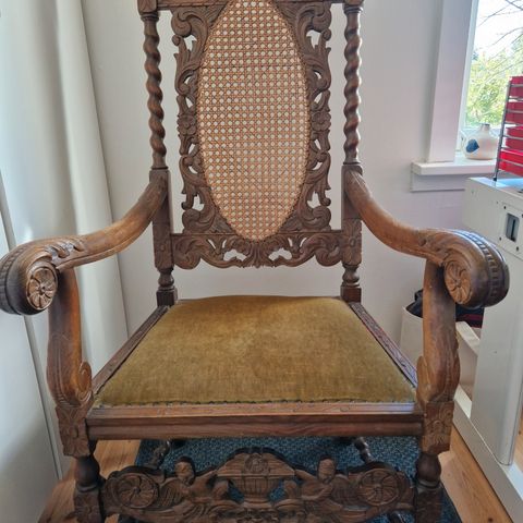 Dette sæt smukke, gamle kongestole i massivt egetræ er et sjældent fund for den, der værdsætter klassisk håndværk og rigt dekoreret møbeldesign. Stolene oser af herskabelig stil og bringer straks tankerne hen på adelige saloner, herregårde og gamle slotte.