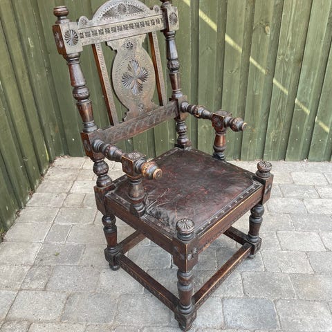 Ryglænene er prydet med fine, håndlavede broderier – hver stol har sit eget unikke udtryk med mønstre, der emmer af tid og tradition. Træværket er smukt udskåret med dybe detaljer, snoede ben og udfræsninger, som vidner om stor møbelkunst og solidt snedkerarbejde. Alt er udført i massivt egetræ med naturlig patina, der kun gør stolene endnu mere autentiske.