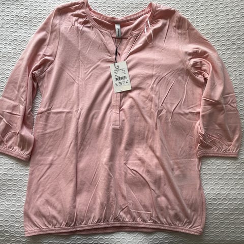 Blusen har et mønstret design med blomsterdetaljer og hvide kantdetaljer omkring halsen, samt elastik i ærmegab.