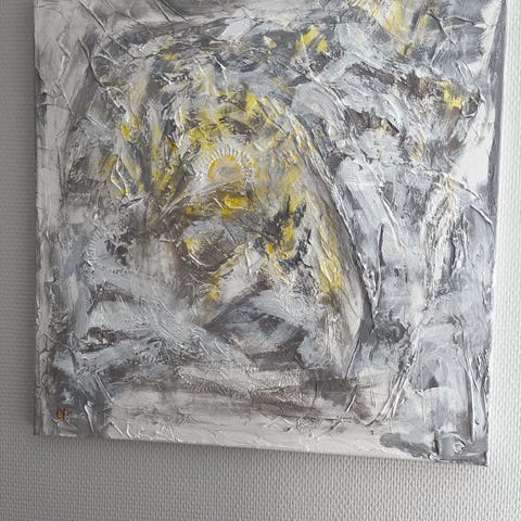 Anne Kureer maleri med abstrakt og figurativt motiv af to personer. Værket er udført med tydelige penselstrøg og dominerende varme farver som rød, orange og pink. Maleriet er indrammet.