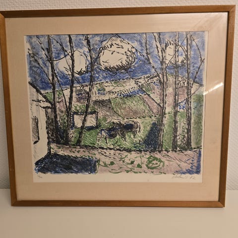 Ny pris: Signeret grafisk kunsttryk med abstrakt landskabsmotiv. Nummereret 21 ud af 200 eksemplarer. Trykt på papir med en kombination af farver som grøn, brun og grå. Passer til indramning og dekorative formål.