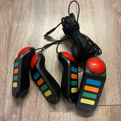 Stand: Brugt, men i god stand og fuldt funktionelle. Se billederne for detaljer. De farvede knapper (blå, orange, grøn, gul) og den store røde 'Buzz' knap fungerer perfekt.