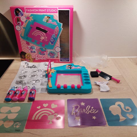 Dette kreative sæt indeholder en række Barbie-tema ting, herunder et pink plastomslag med snaplukning, stencils, farveblyanter, klistermærker og skabeloner. Sættet kommer med dekorative og kreative elementer til børn, herunder figurer og symboler til tegning og dekoration.