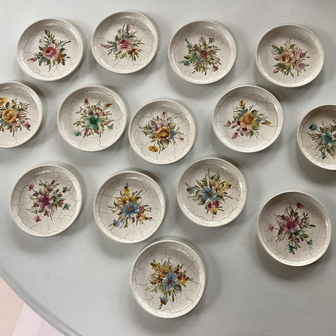 Sæt bestående af 1stk flaskebakke og 12 glasbakker med indgraveret blomster dekoration. Bakkerne har en rund form og er tænkt som beskyttelse af bordplader. Materialet er rustfrit stål, hvilket giver holdbarhed og har et klassisk udseende.