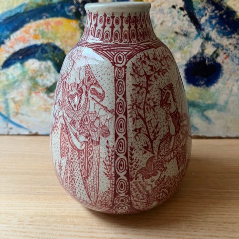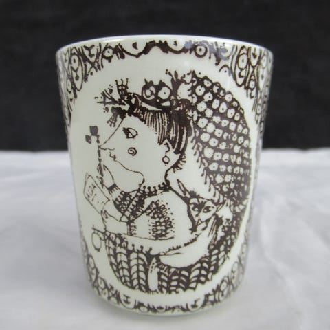 Smuk lille vintage kop fra Nymølle, designet af den ikoniske danske kunstner Bjørn Wiinblad. Motivet er udført i vinrød på hvid baggrund og viser Wiinblads karakteristiske eventyrlige univers med fine detaljer og elegante streger.