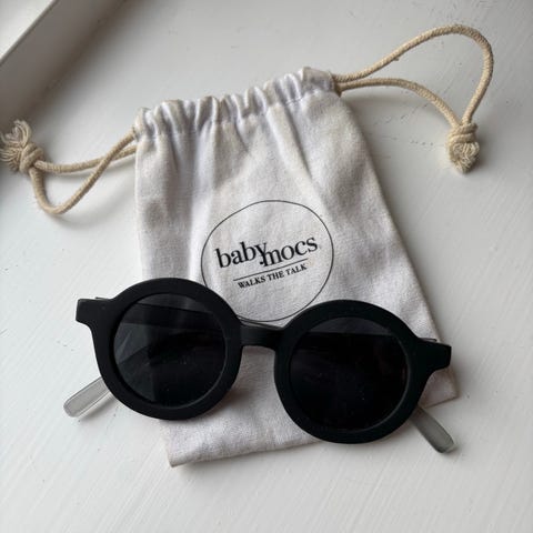 Babiators solbriller, et must for babyer da de er umulige at brække. Har et par små ridser på det ene glas men ikke noget der påvirker udsynet. Kan hentes I Hørsholm eller sendes med fiks og færdig.