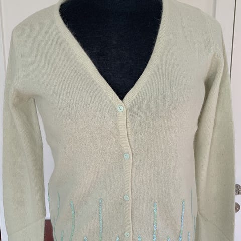 Cardigan fra Stylesnob i farven beige eller camel og størrelsen L med et brystmål på cirka 98 cm og en længde på cirka 58 cm. Trøjen er fremstillet af 40% angorauld, 30% uld og 30% bomuld. Cardiganen er helt ny og ubrugt.