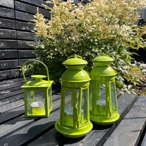 Sæt bestående af tre sorte metal lanterner med glasvinduer i forskellige størrelser. Lanternerne har en firkantet form og er designet til at holde lys eller stearinlys. Velegnet til både indendørs og udendørs brug.(kontant betaling)