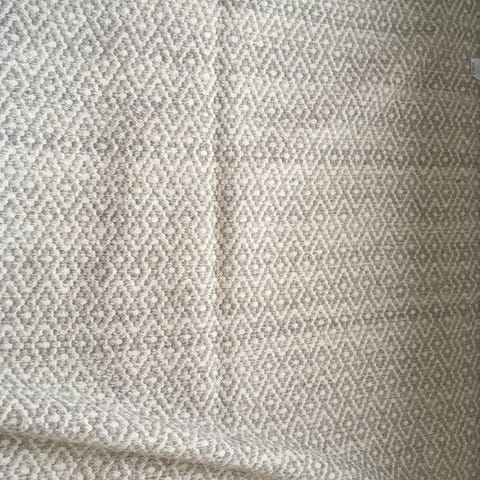 80% Wool/20% polyester på fronten.100% bomuld på bagside.
