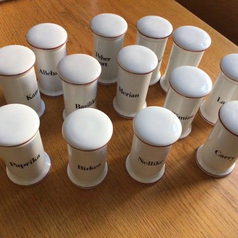 Bing & Grøndahl krydderi glas sæt i hvidt porcelæn med låg. Sættet indeholder seks glas til krydderier: bager pulver, Carry, Vanille, Paprika, Kardemomme og Kanel. Glasene har sort tekst og en rød kant rundt om låg og bund sender gerne køber betaler porto.