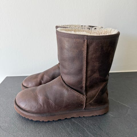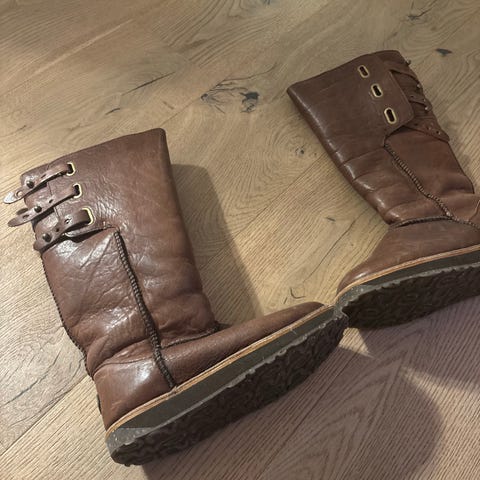 UGG støvler i størrelse 40, lavet af sort læder. Støvlerne har en træhæl og sølvfarvede nitter langs sålen. Indvendigt er de foret med lyst lammeskind, der kan rulles ned for et andet udseende. Sålen har et mønster for bedre greb.
