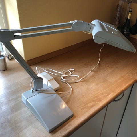 Luxo JAC 1x13W 2PIN, bordlampe/kontorlampe hvid farve, klemme til montering og fleksibel arm. Lampen er designet til præcisionsarbejde Strømforsyning via 230V med tobenet stik.