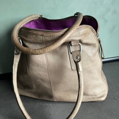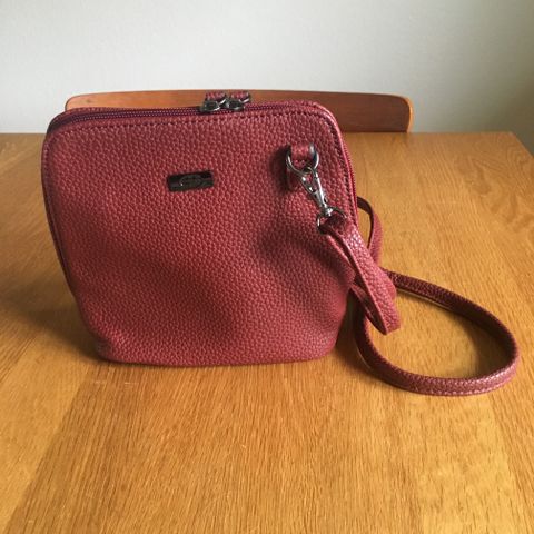 Beslag af “guld”. Sort inderside. Lille sidelomme med lynlås.