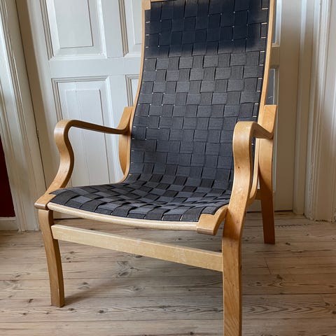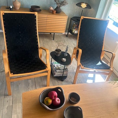 Stellet er massivt bøgetræ, mens sædder/ryg er betrukket med uldstof. De blev ombetrukket for ca 10 år siden af professionel møbelpolster med stof fra Kvadrat.