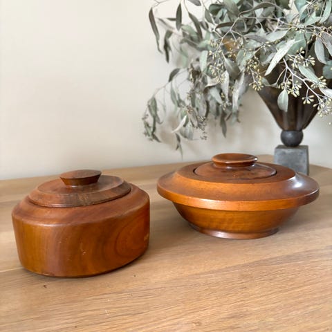 Smuk, håndlavet træskål med flotte udskæringer i blad- og frugtmotiv.
