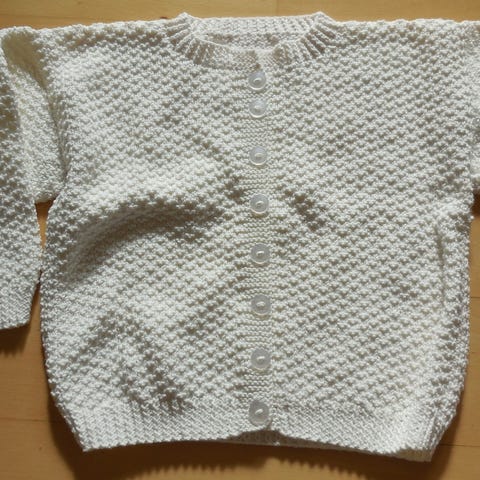 Hjemmestrik unisex børnetrøje i størrelse 50, blå farve. Trøjen har knapper foran og et bamsemotiv på fronten. Materialet og yderligere detaljer er ikke angivet.