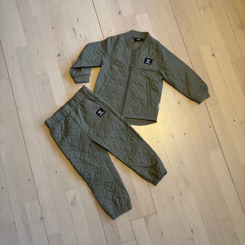 Sæt med jakke og bukser. Brugt, men i god stand. Der er en hvid malingplet på det ene knæ.