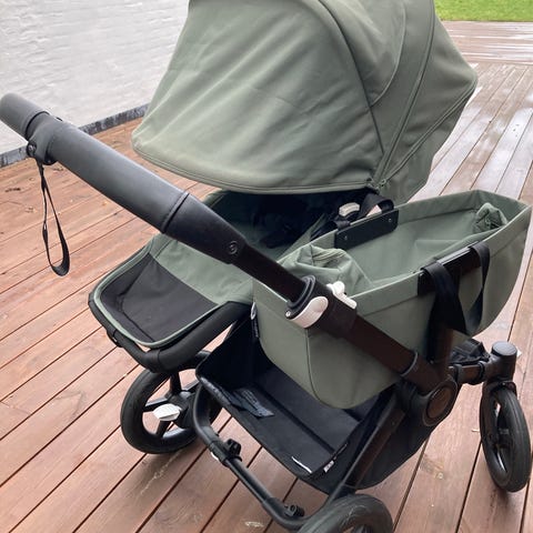 Bugaboo tilbehør til klapvogne med rødt og beige mønster, inklusive regnslag, polstring og puder. Passer til forskellige modeller og giver ekstra komfort og beskyttelse til børnene.