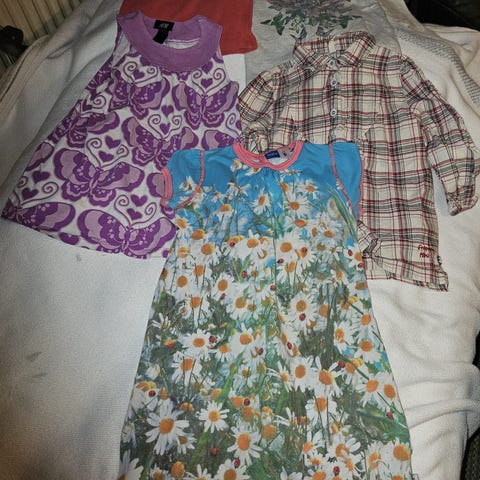 Tøjet er gmb. Enkelte dele har små pletter der knapt ses. Tøjet nederst i højre billede medfølger gratis pga pletter.