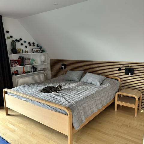 Spar 50% på 2 Auping sengebord model Noa. Sengeborde i egetræ og sortlakeret stel, med magasinholder kan stilles vandret eller lodret. Her er tale om et sæt på 2 sengeborde / udstillingsmodeller uden, eller med helt begrænsede brugsspor.