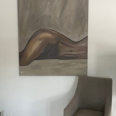 Et stemningsfuldt og sensuelt maleri i lilla og blå nuancer, hvor formerne flyder sammen i et intimt møde mellem to sjæle. Farverne smelter som energi og bevægelse, og værket udstråler varme, nærhed og forbindelse.