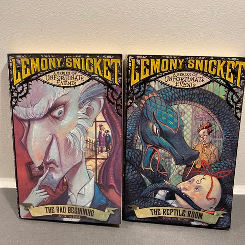 2 x Lemony Snicket bøger slangeværelset og den onde greve for 75kr