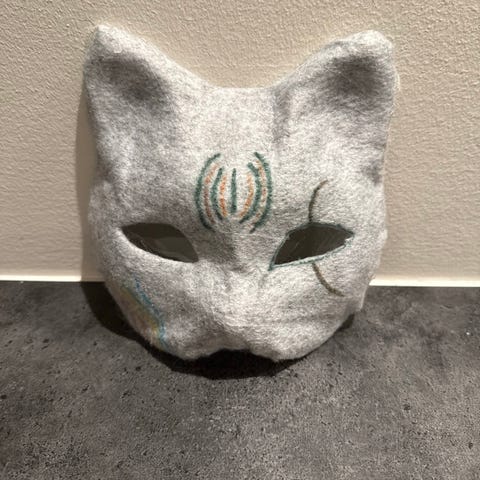Håndlavet kattemaske med hvid og lilla farve. Masken har net over øjnene og er lavet af stofmaterialer med bløde detaljer. Velegnet til udklædning eller teaterbrug. Masken har ører og detaljer, der efterligner en katte ansigt.