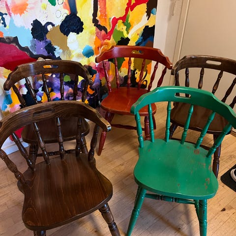 Ca 40 stk. Virkelig solide gamle patinerede Kro stole, produceret af Boltinge møbelfabrik i Ringe.