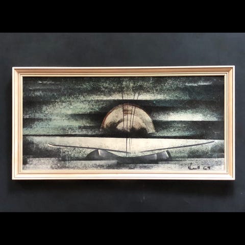 LJ 2006 maleri af en kvinde med et stort lilla kranium og pink krop, omgivet af gule blomster. Maleriet er indrammet og udført på lærred. Datoen 2006 er markeret i nederste hjørne.