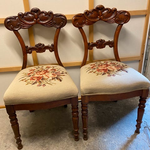 2 svenske træ stole. sælges 500/stk eller begge for 900,-., den i midten er solgt og den blå og hvide er tilbage.