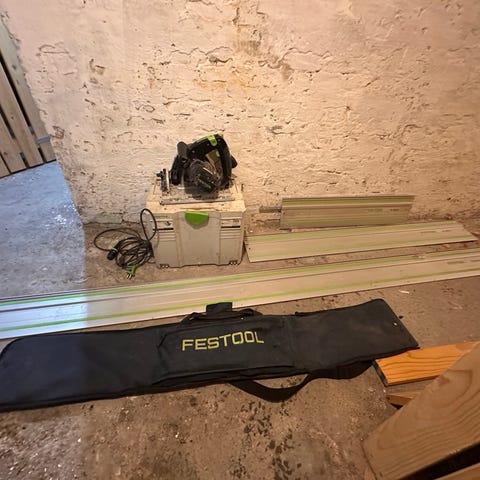 Festool TS 55 FEBQ Dyksav med 2 klinger den ene er til træ den anden er til fibercement. Fungere som den skal. Med en 1,5 meters makita skinne og en kasse til at have den i.