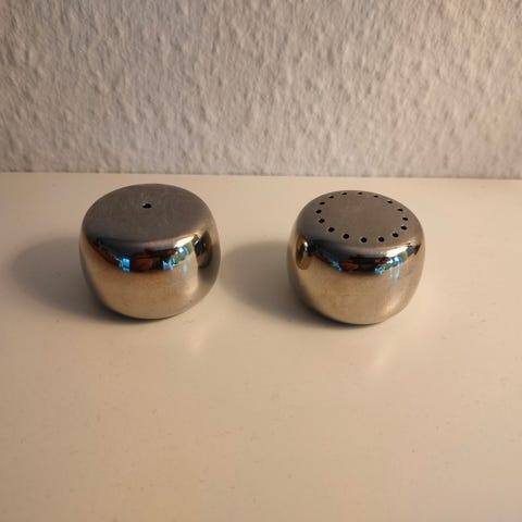 Georg Jensen salt- og peberbøsse sæt i rustfrit stål. Sættet består af to bøssere med perforerede låg til salt og peber. Designet er enkelt og funktionelt, velegnet til brug i køkken eller på spisebordet.