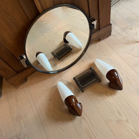 Væglampe i rustfrit stål med hvid skærm. Lampen har en firkantet base og en rektangulær, hvid skærm. Egnet til montering på væg, for eksempel over spejl i badeværelse eller andre rum. Designet til brug med standard pærefatning.