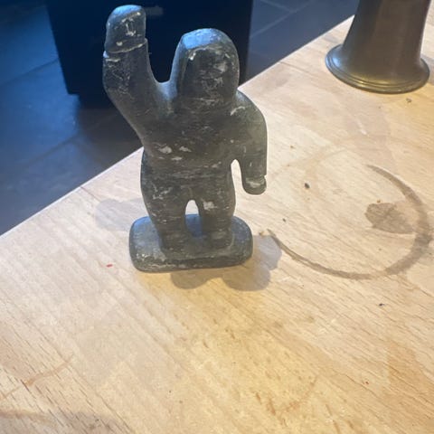 Keramik figur af en siddende eskimo i hvid og sort farve. Figuren har detaljeret beklædning og er velegnet som dekorativ genstand.