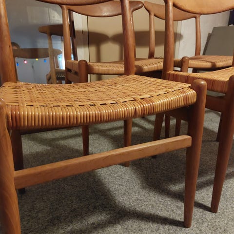 Hans J Wegner spisestuestole med rød stofpolstring og ramme i eg. Stole med armlæn og høj ryg, designet til at give komfort ved spisebordet. Materialerne omfatter træ og tekstil. Farven på polstringen er rød, og stellet er i naturlig egetræ. Velegnet til brug i spisestue eller opholdsområde. Helt nyt rødt stofbetræk der aldrig har været brugt.