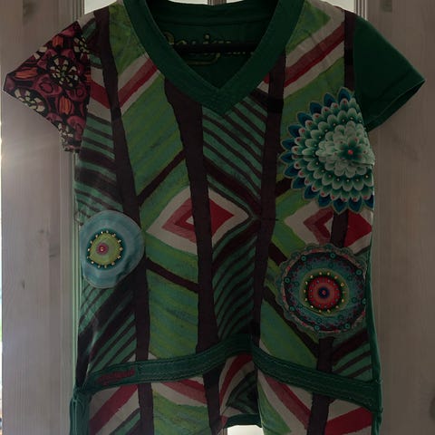 Desigual T-shirt i multifarvet design, størrelse M, til kvinder. T-shirten har et farverigt mønster med cirkler og prikker samt en sommerfugl og logo på fronten. Materialet er let og velegnet til dagligt brug.